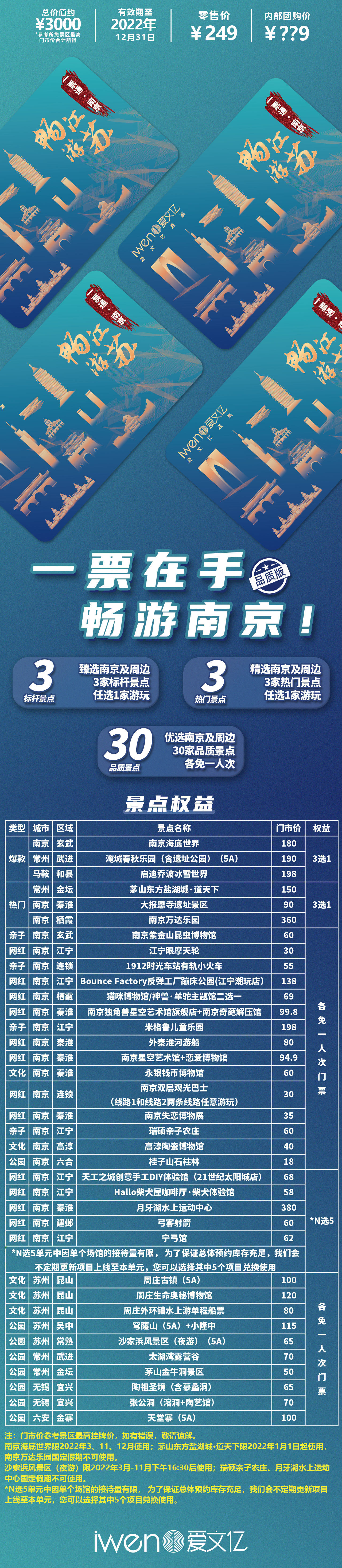精选南京及周边3家标杆景点任选1家游玩,优选南京及周边30家品质景点各免一人次,产品总总价值超3500元,品质版零售价249元。品质景点:南京海底世界、淹城春秋乐园、启迪乔波冰雪世界、茅山东方盐湖城道天下、大报恩寺遗址景区、南京万达乐园、南京紫金山昆虫博物馆、1912时光车站有轨小火车、南京独角兽星空艺术馆旗舰店、米格鲁儿童乐园、南京星空艺术馆+恋爱博物馆、南京双层观光巴士等;上海旅游协会会员单位以及相关行业单位专享福利南京品质版采购价只要159元!专享上海品质版采购价只要199元。两份福利产品有效期至2022年12月31日。农历新年,无论在上海、南京还是周边游,都能超值畅玩,还不快来抢购!
