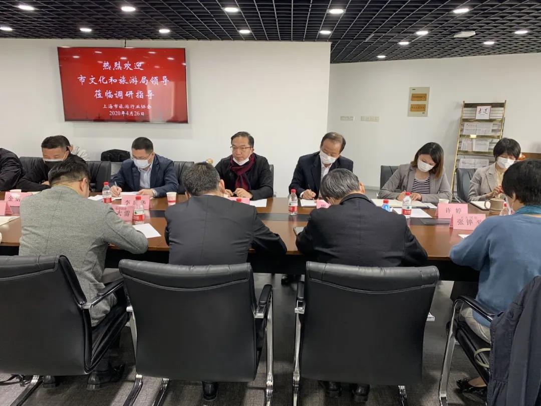 4月26日上午,上海市文化和旅游局金雷副局长一行来到协会,就新冠肺炎疫情防控及疫后行业复工复产工作进行调研。上海市旅游行业协会常务副会长邵晓明,上海市旅游行业协会秘书长许婷,上海市旅游行业协会旅行社分会秘书长金炳文,上海市旅游行业协会导游事务服务中心主任吴泳丽,以及上海航空国际旅游(集团)有限公司、上海中国青年旅行社有限公司、上海众信国际旅行社有限公司、上海春秋旅行社有限公司、一起游国际旅行社有限公司、上海天天国际旅行社有限公司等旅行社企业代表、导游代表参加了调研座谈。会议由上海市文化和旅游局市场管理处李兵华处长主持。
