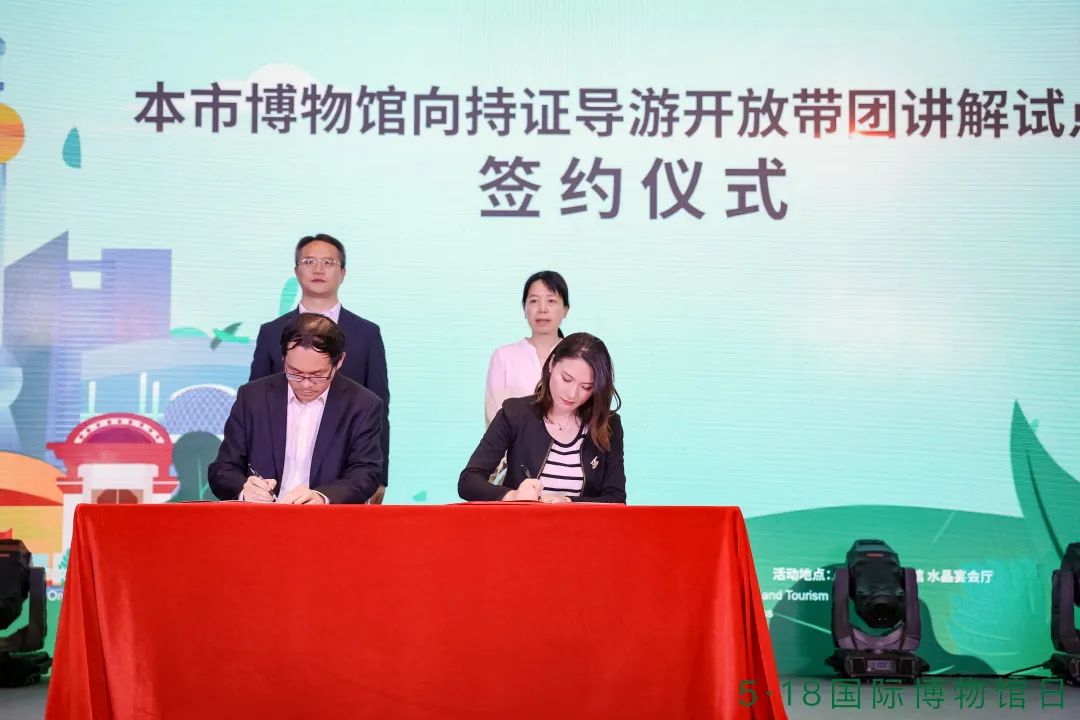 上海主会场活动于5月18日在喜迎12岁生日的上海玻璃博物馆举办。在活动期间,上海市旅游行业协会携5A旅行社代表——锦江旅游控股有限公司、上海春秋旅行社有限公司与上海市历史博物馆(上海革命历史博物馆)就“博物馆向持证导游开放带团讲解试点”率先签订合作协议。这是立足行业和市场发展需求,推动文旅融合的卓越实践。