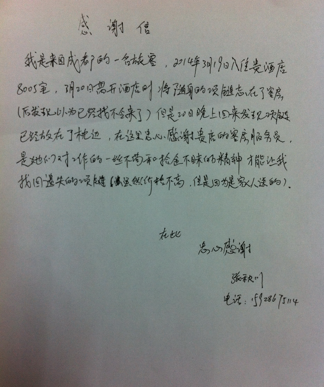 2014年3月21日早晨,古北湾大酒店人力资源部收到了一封来自成都张先生的感谢信,高度赞扬酒店员工高尚的品德和优质的服务。酒店员工拾金不昧,使他原以为已经遗失的项链又失而复得。当饭店按照客人提供的信息找到这位员工时,她说“这事太普通了,真的不值得表扬,这是我们份内的事情,要是其他员工碰到,也会这样做的”。她就是客房部服务员薛加兰。正是她这种真诚的服务,感动着宾客,让宾客深深地体验到“宾至如归”的感觉。