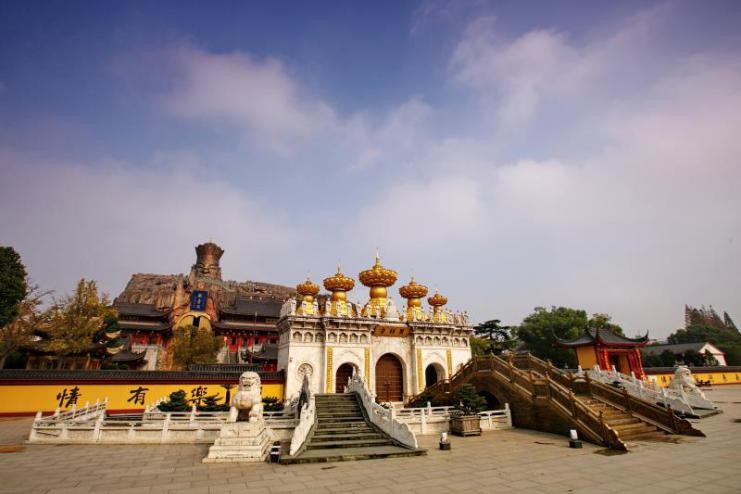雄伟壮观的三进式、阶梯式,错落有致的联体的建筑群。各个殿堂就坐落在突兀而起、巍然而立的山体之中,山是一尊佛,佛是一座山,山即是佛,佛即是山,山佛一体,佛山一气。整座山高达57米,远远望去,就像一尊头带宝冠,呈卧立态,巨臂横空,手向东方的大佛。形成山如佛,佛是山的奇观。